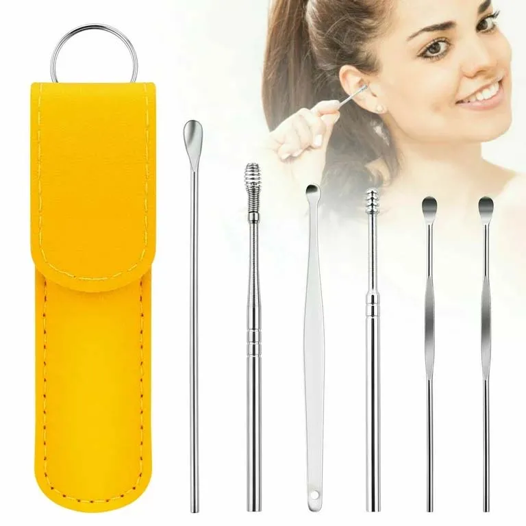 "Product Title": "6 Pcs Ear Wax Cleaning Kit, Ear Pick Set, Spring Earwax Cleaner Tool, Reusable Ear Cleaner for Children and Adult Multifunction Portable, Stainless Steel Tool with Portable Fashion Leather Bag- Yellow",